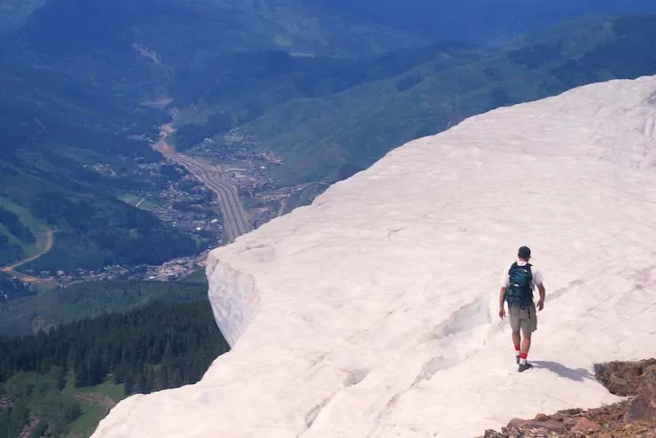 Mountain snow has generally diminished since this photo was taken in July 1997 on Bald Mountain looking down on I-70 and Vail. Photo/Allen Best. Top, Jonathan Overpeck delivering a lecture. Photo/.Dave Brenner
