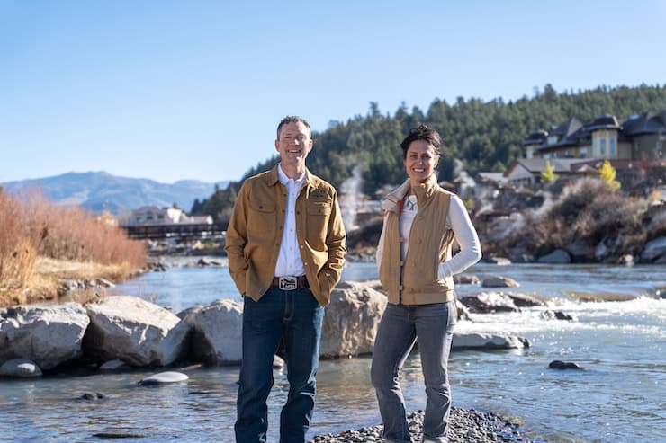 Chris Hansen, CEO of La Plata Electric, and Nicole PItcher, the chair of the board of directors, stand along the edge of the San Juan River in Pagosa Springs, one of the communities that is part of La Plata Electric. Photo/La Plata Electric Association.
