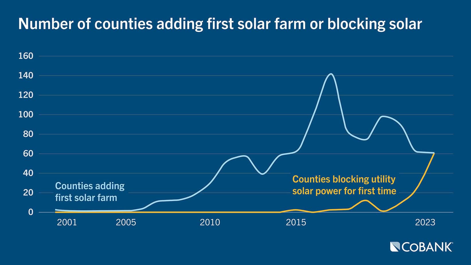 Counties across i American in the last few years have been adopting regulations that effectively block solar development, according to this chart from COBank using information from USA Today.
