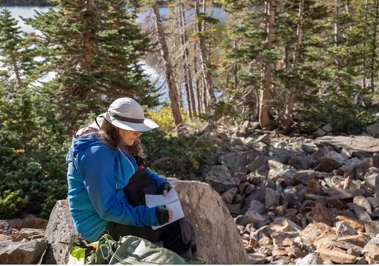 Chris Ray makes notes during a pika survey in the Indian Peaks Wilderness Area. Photo/Gabe Allen, INSTAAR. Top photo/ Steve Torbit, U.S. Fish and Wildlife Service