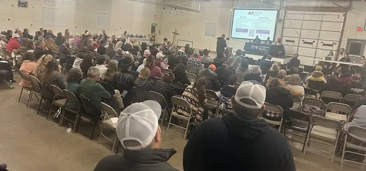The meeting was held at the Elbert County fairgrounds. Banners on the wall proclaimed honors earned by the local 4-H clubs in statewide competition. One was for a horse bowl team, others for rabbit judging. Dress was casual. Nearly all the men wore hats. A wooden cross stood in a corner. One woman wearing a bright orange shirt that said “Rural Lives Matter.”