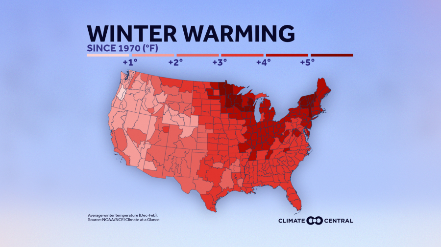 Climate Central meteorologist Sean Sublette says the precise warming levels vary, but the broader picture is clear across the United States. Most prominent was the heating in the Great Lakes states and the Northeast.