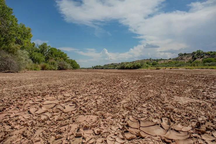 For the second time in the 21st century, this segment of the Rio Grande in Albuquerque went dry, leaving this image of cracked sediment on a blistering afternoon on Aug. 7, 2025. Photo(and copyright)/WWF-us, Diana Cervantes