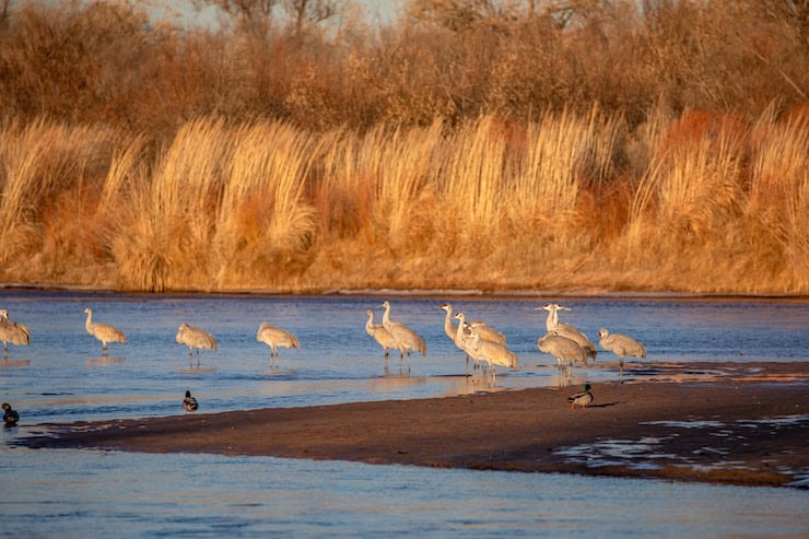 Sandhill cranes and a few mallard ducks roost at sunset on a sandbar of the Rio Grande in Albuquerque during January. Photo(and copyright)/WWF-us, Diana Cervantes. Top: The San Luis Valley near Del Norte. Photo/Brian Richter