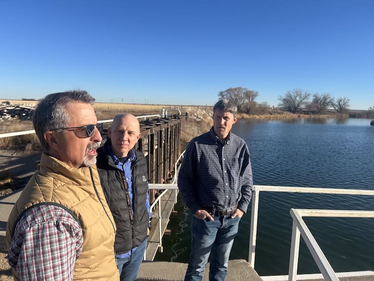 Jim Yahn, left, manager of the Prewitt Reservoir, which might become part of the Platte Valley Water Partnership, speaks with Ron Red, manager of Parker Water and Sanitation District, and Joe Frank, general manager of the Lower South Platte Water Conservancy District, which is part of the proect. There is still hope that Prewitt would be part of the plan,” says Yahn. “The decree that Parker and Lower South Platte are seeking still has Prewitt Reservoir as a component of the plan.”