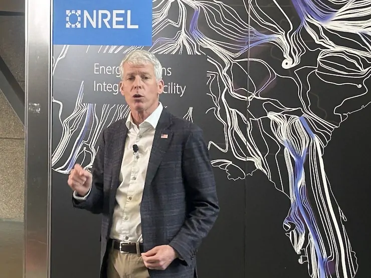 Chris Wright, secretary of the Department of Energy, spoke with reporters in April 2025 after touring the National Renewable Energy Laboratory. Photo/Allen Best