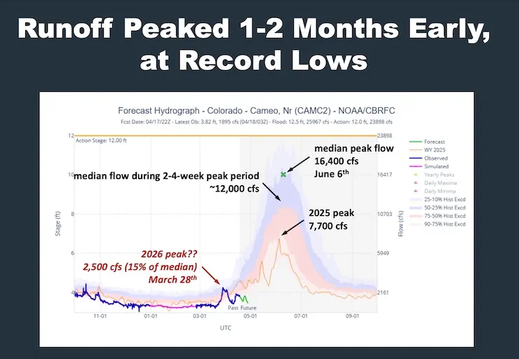 With moisture coming into Colorado during the next two weeks, it’s possible that the runoff into Lake Powell may surpass that of 2002. This slide says that right now, at Cameo, the gaging station on the Colorado River, east of Palisade, it looks like the spring runoff peaked in late March. The usual is in early June.